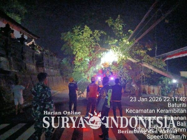 Tabanan, Surya Indonesia.net – Polsek Kerambitan, Jumat 23 Januari 2026; Bhabinkamtibmas Desa Baturiti bersama Babinsa dan BPBD Kabupaten Tabanan serta Warga Masyarakat Desa Baturiti laksanakan kegiatan pembersihan terhadap Pohon Tumbang yang terjadi tepatnya di Depan TK Santi Kumara Desa Baturiti – Kerambitan.
