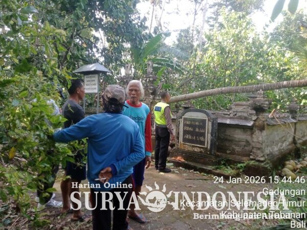 Tabanan, Surya Indonesia.net – Polsek Selemadeg. Minggu, 25 Januari 2026. Cuaca ekstrem berupa angin kencang memicu tumbangnya pohon kelapa setinggi belasan meter yang menimpa Pura Bedugul Subak Abian Mertasari, Banjar Dinas Gamongan, Desa Selemadeg, kemarin pada Sabtu (24/1/2026) sekitar pukul 14.00 Wita. Insiden di lahan milik I Ketut Medra ini merusak sejumlah fasilitas suci seperti Pelinggih Pemayasan, Bebaturan, hingga penyengker pura. Meski tidak ada korban jiwa, kerugian materiil yang ditanggung 42 KK pengempon pura diperkirakan mencapai Rp10.000.000.