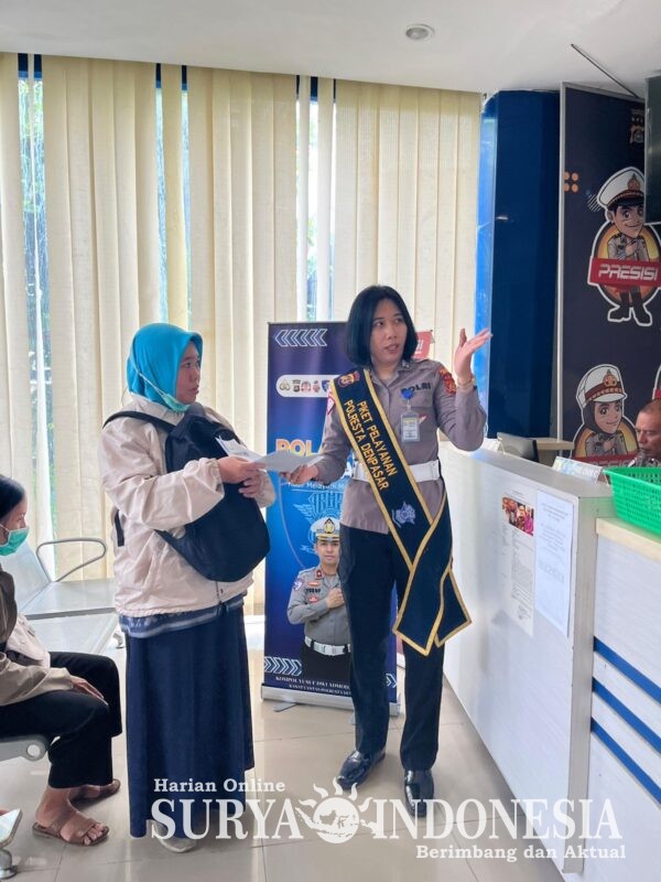 Suasana di ruang pelayanan SATPAS SIM Polresta Denpasar terlihat teratur dan penuh semangat. Petugas yang bertugas dengan mengenakan selempang bertuliskan “PELAYANAN POLRESTA DENPASAR” aktif memberikan arahan dan bantuan kepada setiap pemohon yang datang. Seperti yang terlihat dalam aktivitasnya, salah satu petugas sedang dengan sabar menjelaskan tahapan pengurusan serta memberikan informasi lengkap kepada seorang pemohon yang sedang mengurus keperluan SIM-nya.