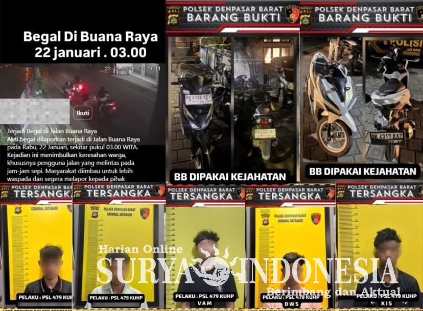 Denpasar, Surya Indonesia.net – Lima Pelaku Begal yang Viral di Medsos Berhasil Diamankan Unit Reskrim Polsek Denpasar Barat Unit Reskrim Polsek Denpasar Barat berhasil mengamankan lima orang pelaku aksi begal yang sempat viral di media sosial beberapa waktu lalu, Peristiwa tersebut terjadi pada Kamis, 22 Januari 2026 sekitar pukul 03.29 WITA, di Jalan Buana Raya, tepatnya di depan Apotik Nathan, Kelurahan Padangsambian, Kecamatan Denpasar Barat, Kota Denpasar. Korban dalam kejadian tersebut bernama Muammar (21).