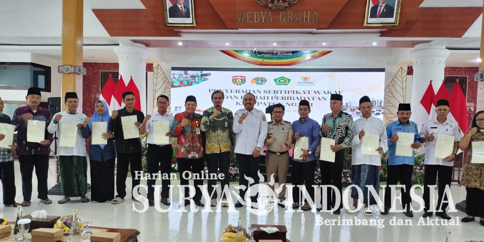 Ngawi,Suryaindonesia.net- Dalam rangka memperkuat kepastian dan perlindungan hukum atas tanah wakaf, Pemerintah Kabupaten Ngawi bersama Kantor Agraria dan Tata Ruang/Badan Pertanahan Nasional (ATR/BPN) Kabupaten Ngawi menyerahkan sebanyak 744 sertifikat tanah wakaf untuk rumah ibadah, kantor KUA dan 3 sertifikat hak milikan Gereja Jawi Wetan. Penyerahan sertifikat tersebut dilaksanakan di Pendopo Wedya Graha Ngawi. Rabu (28/01/2026)