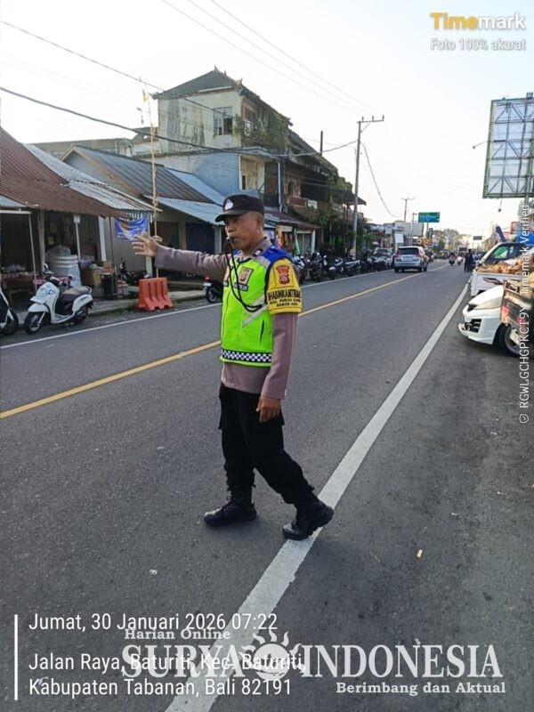 Tabanan, Surya Indonesia.net – Polsek Baturiti melaksanakan kegiatan Strong Point pada Jumat, 30 Januari 2026 di depan Pasar Baturiti. Kegiatan ini melibatkan dua personel yaitu Aiptu I Ketut Polih dan Aiptu I Putu Sutarjana yang bertugas melakukan pemantauan, pengaturan arus lalu lintas, serta membantu menyeberangkan para pengguna jalan di kawasan pasar yang ramai aktivitas masyarakat.