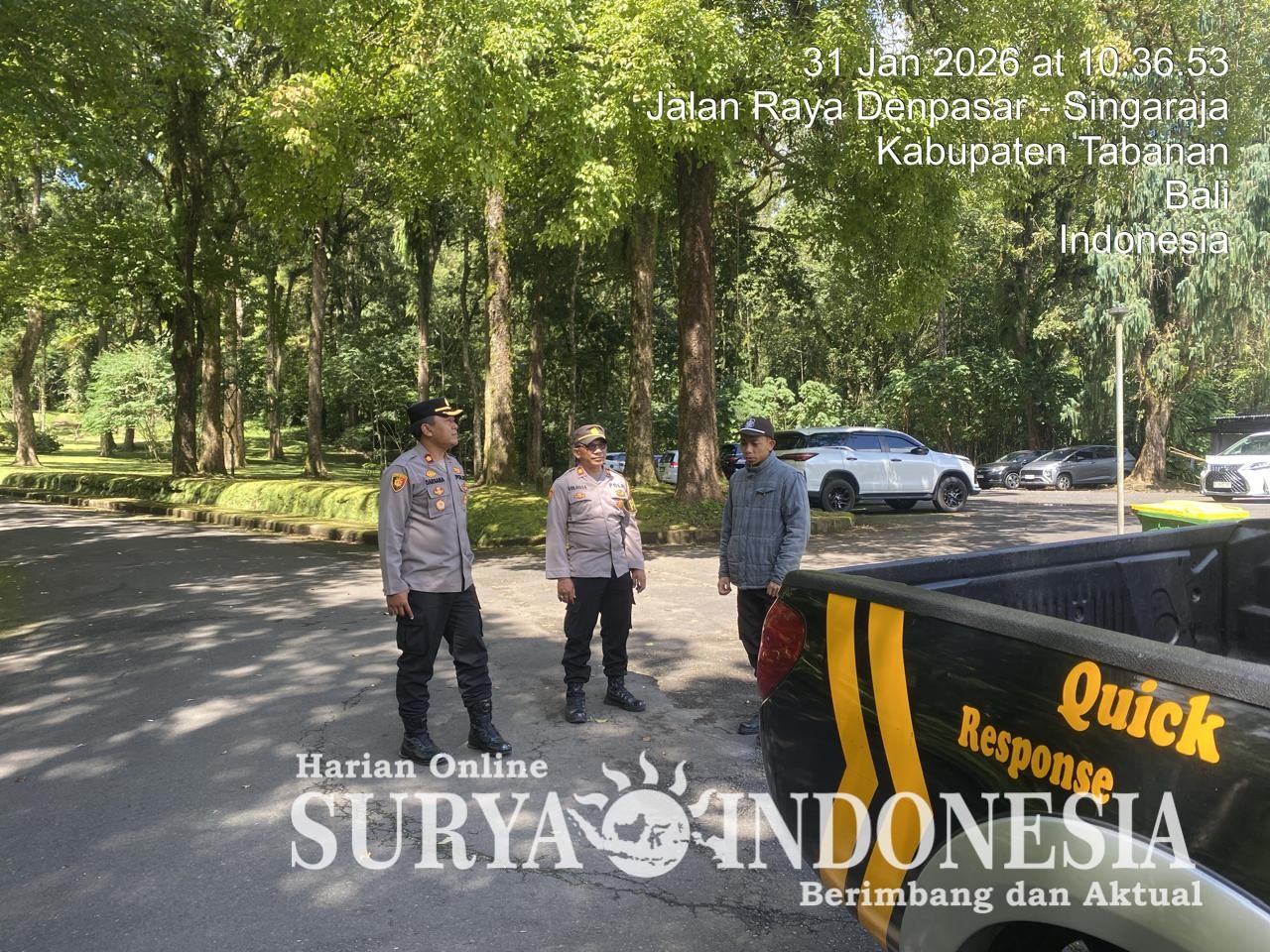 Tabanan , Surya Indonesia.net – Polsek Baturiti melaksanakan pengecekan langsung terhadap personel yang bertugas pengamanan pada Sabtu, 31 Januari 2026 pukul 10.00 Wita di sejumlah jalur dan objek wisata wilayah Kecamatan Baturiti. Kegiatan ini dipimpin Kapolsek Baturiti Kompol Nyoman Darsana, S.H. didampingi Pawas Iptu I Putu Sukayasa guna memastikan kesiapsiagaan anggota di lapangan.
