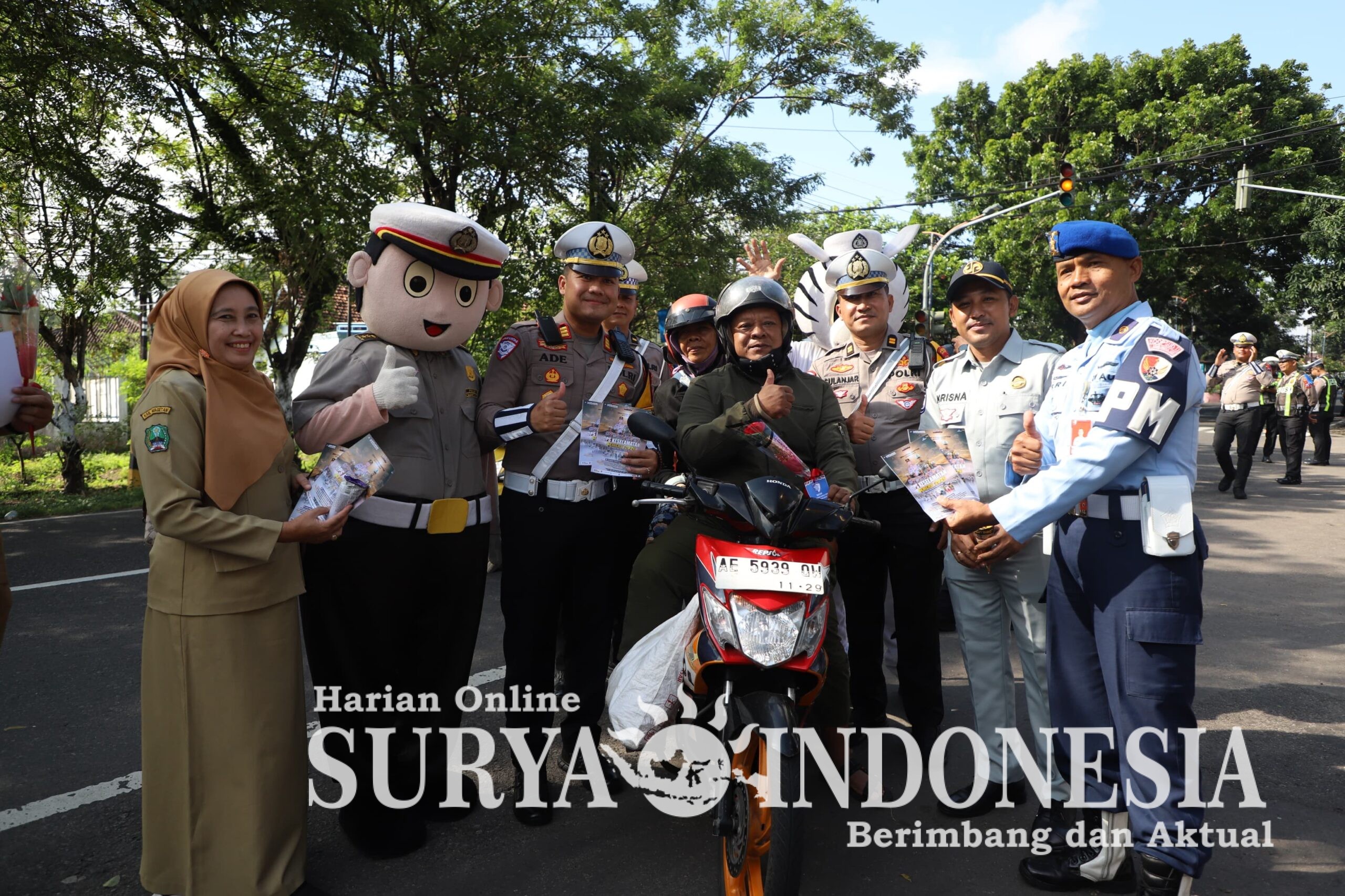 Kegiatan sosialisasi Operasi Keselamatan Semeru 2026 tersebut semakin menarik perhatian masyarakat dengan kehadiran ikon Satlantas Polres Magetan, yakni boneka **Si Polin** dan **Zebra**, yang turut membagikan brosur sosialisasi kepada para pengendara. Kehadiran maskot tersebut disambut antusias dan menciptakan suasana yang ramah serta edukatif di tengah aktivitas lalu lintas.