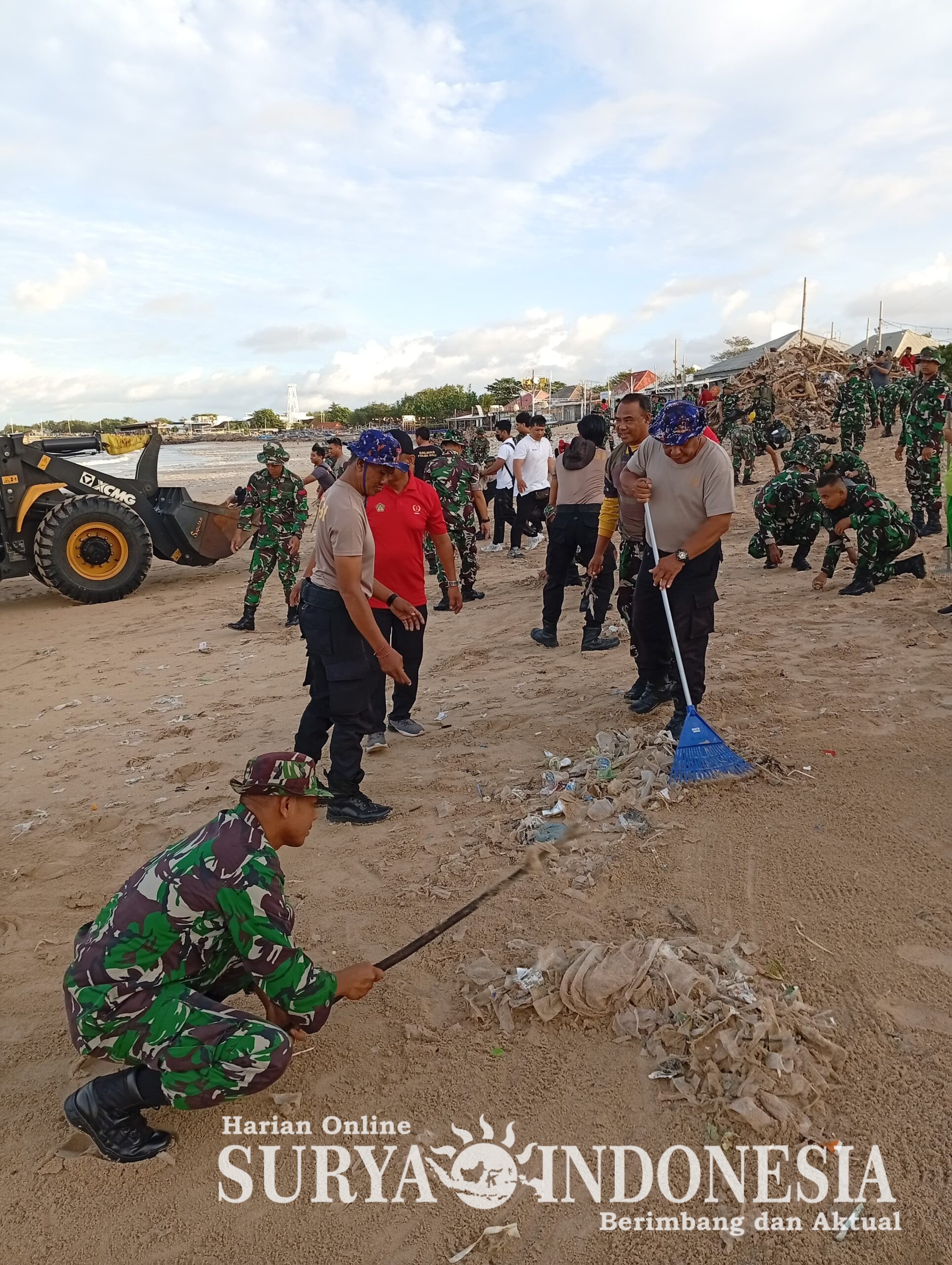Aksi tersebut melibatkan personel TNI/Polri bersama masyarakat setempat dan pengelola kawasan pantai dengan membersihkan sampah plastik, kayu, serta limbah lainnya yang terbawa arus laut dan tersebar di sepanjang garis pantai.