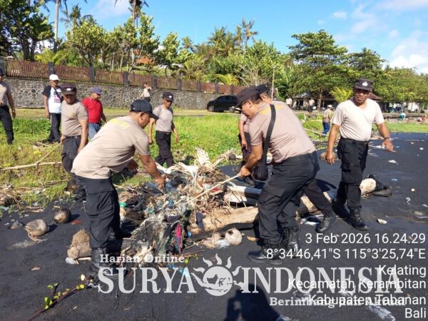Tabanan, Surya Indonesia.net – Polsek Kerambitan Polsek Kerambitan bersama masyarakat Desa Kelating melaksanakan kegiatan korve atau pembersihan sampah di kawasan Pantai Kelating, Banjar Dukuh, Desa Kelating, Kecamatan Kerambitan, Kabupaten Tabanan, pada Selasa, 3 Februari 2026, pukul 16.20 Wita hingga 17.30 Wita. Kegiatan tersebut dipimpin langsung oleh Kapolsek Kerambitan Kompol I Kadek Ardika, S.Sos., M.H., sebagai bentuk kepedulian terhadap kebersihan dan kelestarian lingkungan.