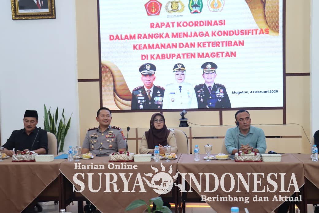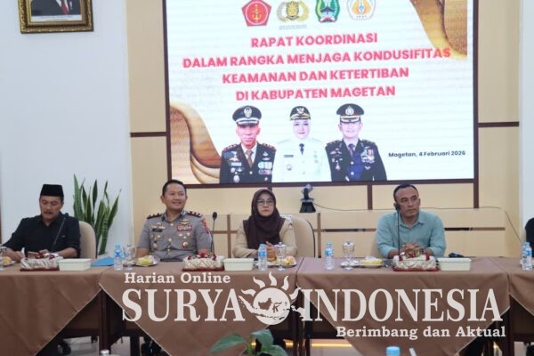 Magetan, Surya Indonesia.net – Forum Koordinasi Pimpinan Daerah (Forkopimda) Kabupaten Magetan menggelar Rapat Koordinasi dalam rangka Menjaga Kondusifitas Keamanan dan Ketertiban Masyarakat (Kamtibmas) sebagai upaya pencegahan konflik terkait permasalahan perguruan pencak silat, Rabu (4/2/2026).