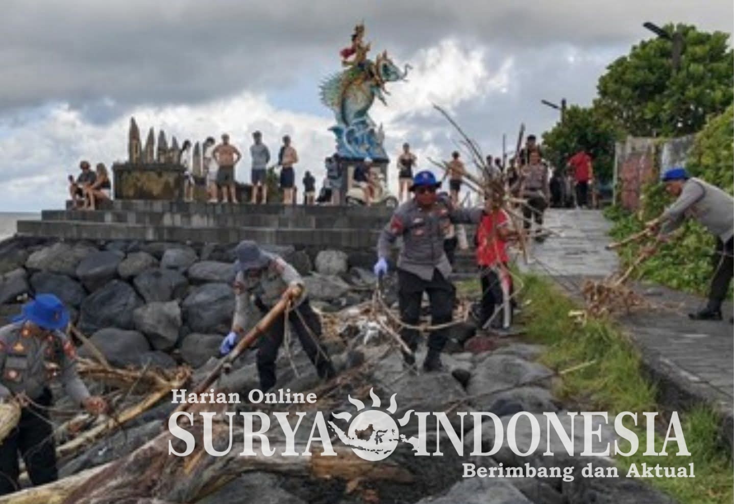 Mangupura, Surya Indonesia.net – Pesisir Pantai Pererenan di Desa Pererenan, Kecamatan Mengwi, Badung, yang dipenuhi tumpukan sampah kiriman berupa batang dan dahan pohon besar mulai dibersihkan pada Rabu, 4 Februari 2026. Aksi bersih-bersih dilakukan sejak pukul 08.00 Wita dengan melibatkan personel kepolisian, perangkat desa, pelaku usaha, hingga siswa sekolah dasar.