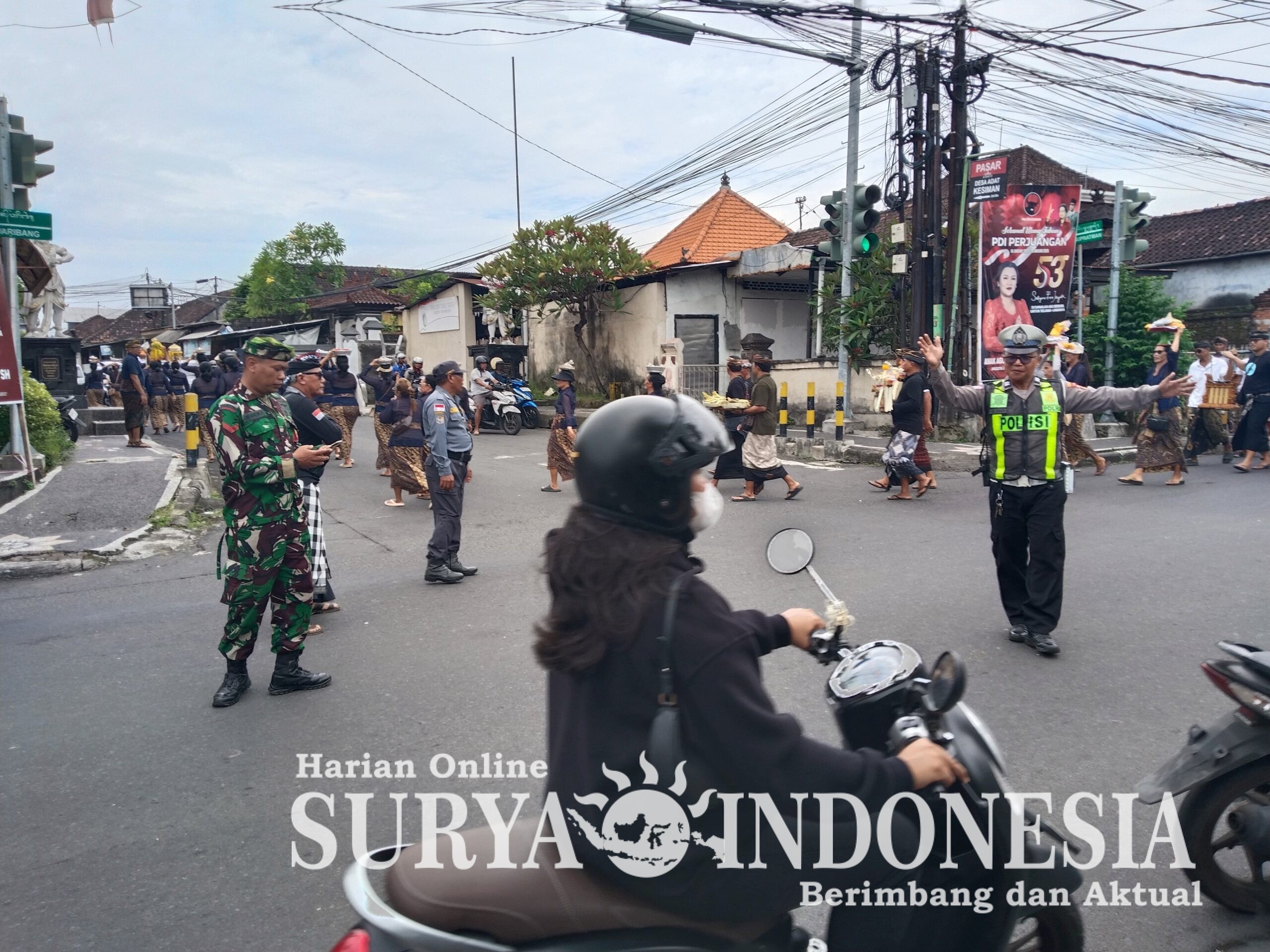 Personel Polsek Dentim bersinergi dengan unsur TNI, Linmas, dan Pecalang setempat guna memastikan kelancaran iring-iringan warga pengusung bade yang melintas di lokasi tersebut.