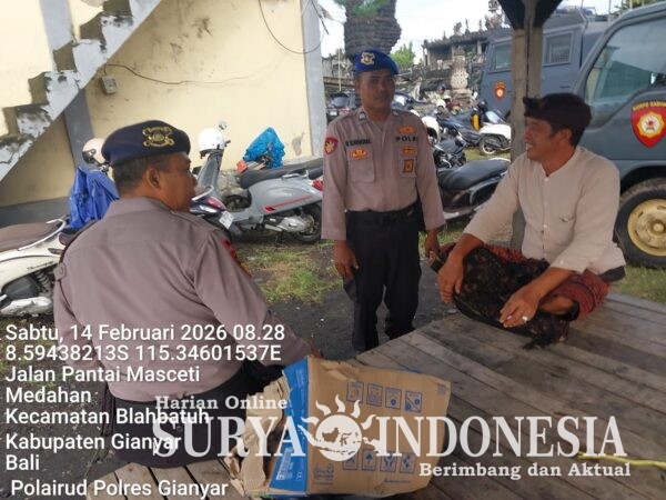Gianyar, Surya Indonesia.net — Personel Polisi Banjar Satuan Polisi Perairan dan Udara (Satpolairud) Polres Gianyar melaksanakan kegiatan sambang masyarakat di pesisir Pantai Masceti, Desa Medahan, Kecamatan Blahbatuh, Kabupaten Gianyar, Sabtu (14/2/2026) sekitar pukul 09.46 WITA.