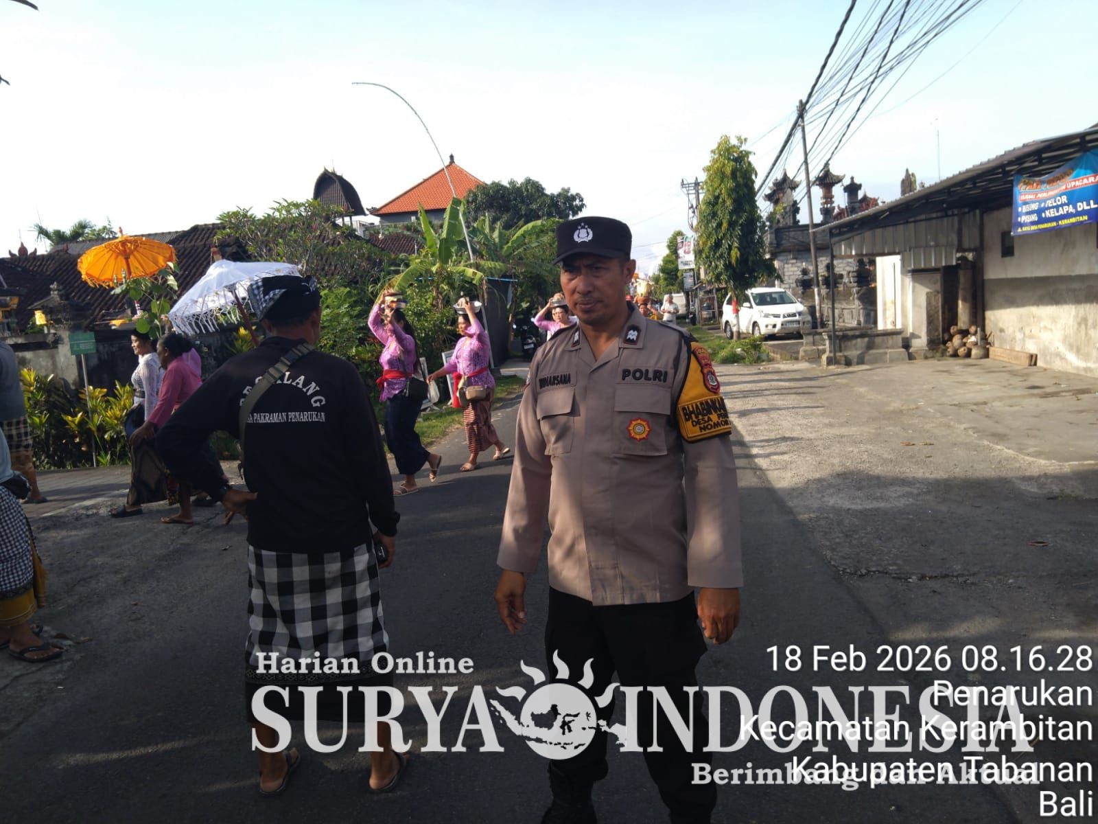 Tabanan, Surya Indonesia.net – Polsek Kerambitan, Rabu 18 Februari 2026; Bhabinkamtibmas Desa Penarukan Aiptu I Putu Widiarsana bersinergi dengan Pecalang laksanakan Pengamanan kegiatan Upacara Pitra Yadnya (Ngaben) bertempat di Banjar Penarukan Tengah Kelod Desa Penarukan hingga Setra Adat Penarukan Kecamatan Kerambitan.