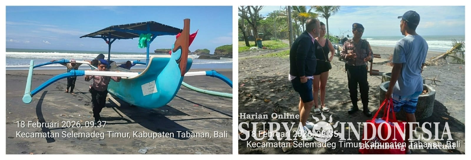 Tabanan, Surya Indonesia.net – Polres Tabanan melalui Satuan Polairud melaksanakan kegiatan patroli pesisir dan sambang di Pantai Klecung pada Rabu, 18 Februari 2026, pukul 10.00 Wita. Kegiatan tersebut dilaksanakan oleh Aipda I Made Sukerta dan Aipda I Gede Bayu Bimantara, S.H., dengan menyasar aktivitas masyarakat serta wisatawan lokal maupun mancanegara yang berkunjung ke kawasan pesisir.