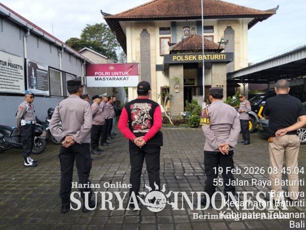 Tabanan, Surya Indonesia.net – Polsek Baturiti pada Kamis, 19 Februari 2026 pukul 08.30 s.d 09.15 Wita melaksanakan kegiatan apel pagi yang dipimpin Wakapolsek Baturiti AKP I Wayan Sukadana dan diikuti seluruh personel. Dalam apel tersebut disampaikan arahan pimpinan terkait kesiapan menghadapi Ops Cipkon menjelang Hari Raya Lebaran dan Nyepi, dengan penekanan pada pemetaan jam rawan kriminalitas, peningkatan patroli, kecepatan respon pengaduan melalui Call Center 110, pemasangan CCTV pada obyek vital dan tempat keramaian, serta penegasan agar anggota tidak terlibat pelanggaran maupun penyalahgunaan narkoba.