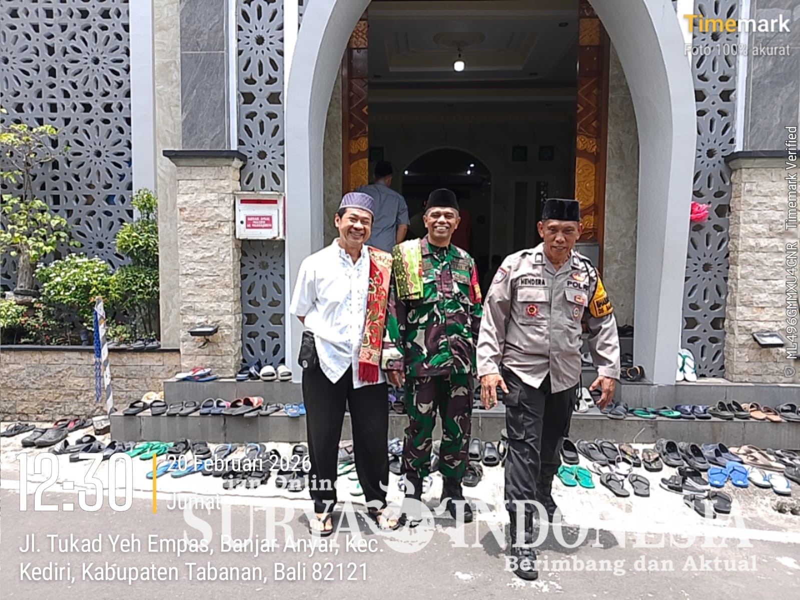 Jumat, tanggal 20 Pebruari 2026, pukul 12.00 s/d 13.15 wita, Bhabinkamtibmas Desa Banjar Anyar 2, Polsek Kediri, Polres Tabanan Aiptu I Nengah Nendera bersama satuan keamanan Mesjid melaksanakan pengamanan giat sholat Jumat di Mesjid Al- Muhajirin BTN Bukit Sanggulan Indah, Banjar Sanggulan Anyar, Desa Banjar Anyar, Kecamatan Kediri, Kabupaten Tabanan.