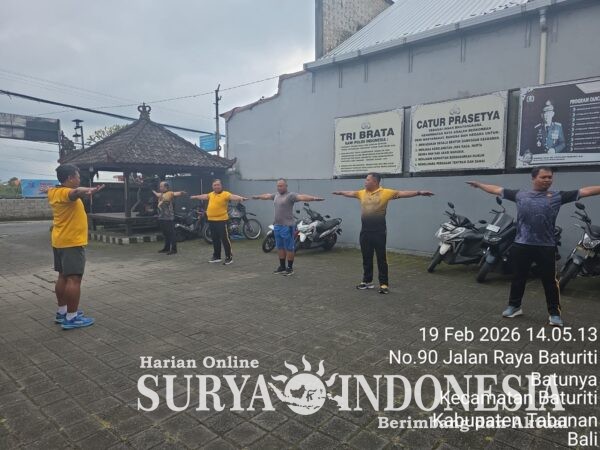 Tabanan , Surya Indonesia.net – Polsek Baturiti, Jumat 20 Februari 2026, melaksanakan kegiatan Gerakan Sehat untuk Produktif (GESIT) pada Kamis, 19 Februari 2026 pukul 14.00 s.d. 15.10 Wita bertempat di Jalan Raya Banjar Baturiti Kaja, Desa Baturiti, Kecamatan Baturiti. Kegiatan tersebut dipimpin langsung oleh Kapolsek Baturiti Kompol Nyoman Darsana, S.H. sebagai bentuk pembinaan fisik guna menjaga kebugaran dan kesiapsiagaan personel dalam pelaksanaan tugas sehari-hari.