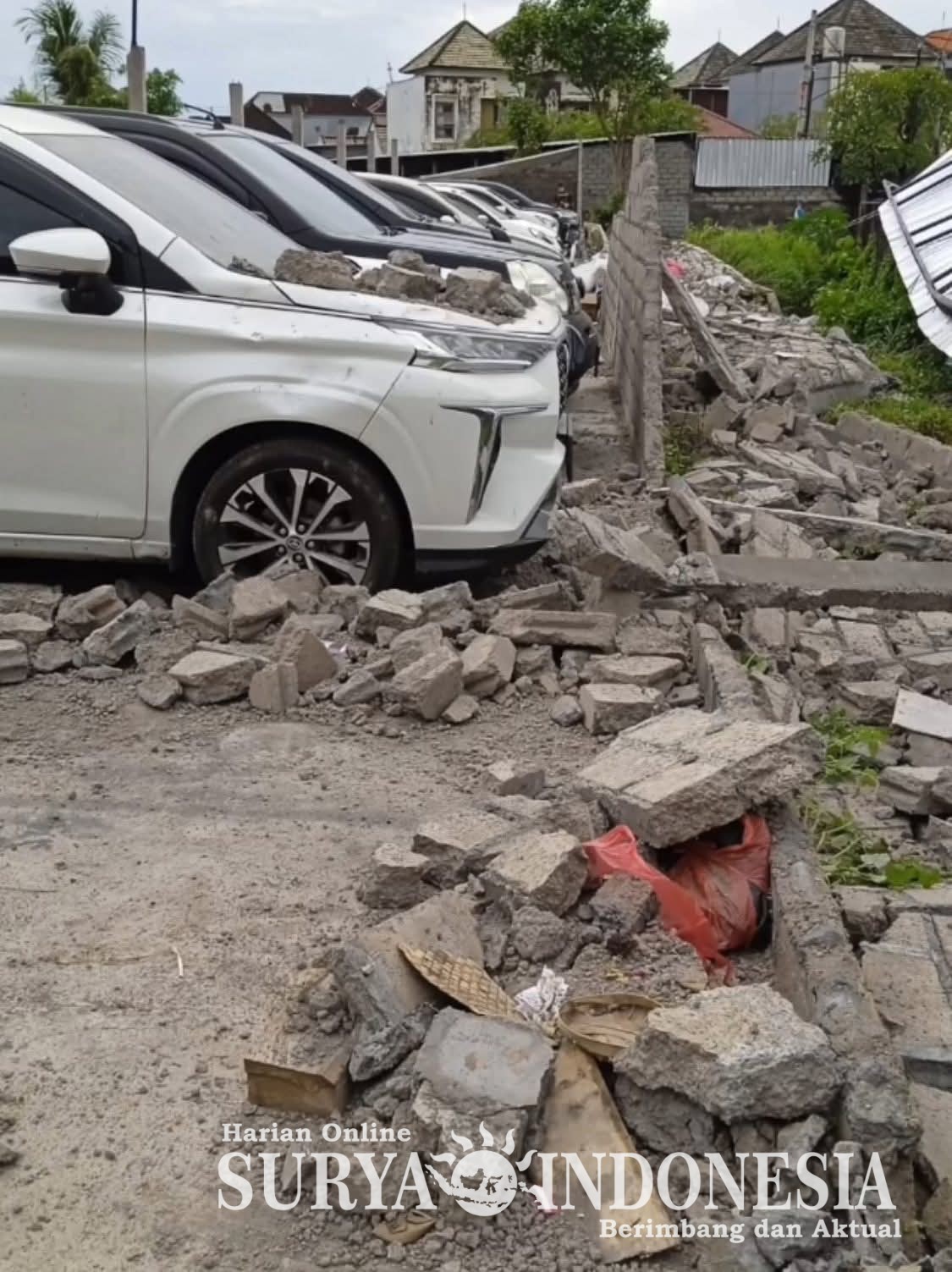 Beberapa mobil milik warga yang terparkir di lokasi tersebut dilaporkan mengalami kerusakan akibat tertimpa material tembok yang roboh.