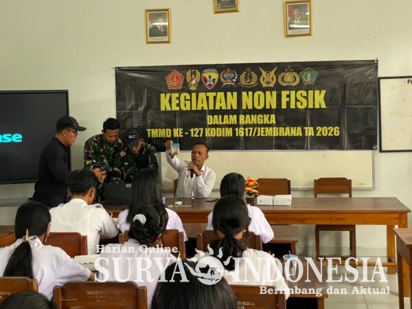 JEMBRANA , Surya Indonesia.net – Dalam upaya memproteksi generasi muda dari ancaman narkotika, Satgas TNI Manunggal Membangun Desa (TMMD) ke-127 Kodim 1617/Jembrana melaksanakan kegiatan non-fisik berupa sosialisasi pencegahan, pemberantasan, penyalahgunaan, dan peredaran gelap narkoba (P4GN) bagi siswa-siswi SMA, Senin (23/02/2026).