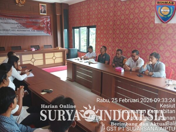 Tabanan, Surya Indonesia.net – Polsek Kerambitan, Rabu 24 Februari 2026; Bhabinkamtibmas Desa Kesiut Aiptu I Gusti Sudarsana menghadiri sekaligus mengamankan kegiatan Rapat Koordinasi dan Peyampaian Pelaksanaan Pemeriksaan terkait Pertanggungjawaban LPJ Desa Kesiut bertempat di Ruang Rapat Kantor Desa Kesiut.