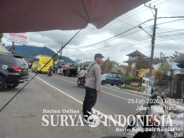 Tabanan , Surya Indonesia.net – Polsek Baturiti melaksanakan kegiatan Strong Point siang pada Rabu, 25 Februari 2026, bertempat di Pasar Baturiti dengan melibatkan dua personel yakni Aiptu I Wayan Dirgayusa dan Aiptu I Putu Gede Widama. Dalam pelaksanaannya, personel tidak hanya melakukan pengaturan dan pemantauan arus lalu lintas, namun juga membantu menyeberangkan masyarakat yang beraktivitas di kawasan pasar serta membantu kelancaran kendaraan yang melintas. Jalur di sekitar lokasi terpantau cukup padat oleh aktivitas masyarakat dan kendaraan.