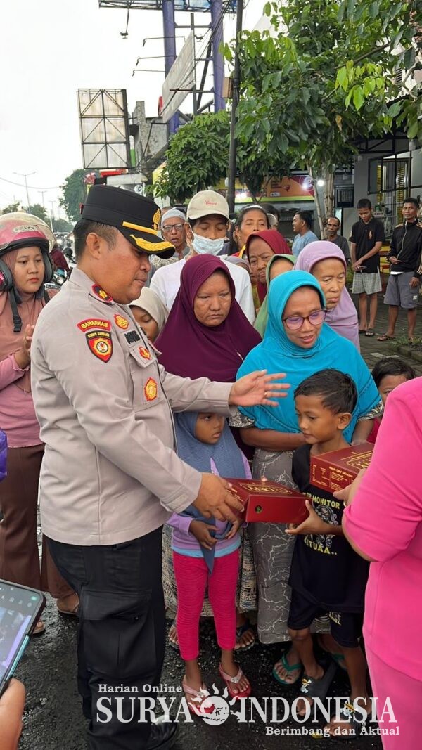 Kehadiran Bhayangkari dan anak-anak disabilitas turut menambah suasana haru dan kebersamaan. Semangat gotong royong serta kepedulian sosial terlihat jelas ketika seluruh pihak turun langsung menyapa dan menyerahkan nasi kotak kepada masyarakat dengan penuh kehangatan dan humanis.