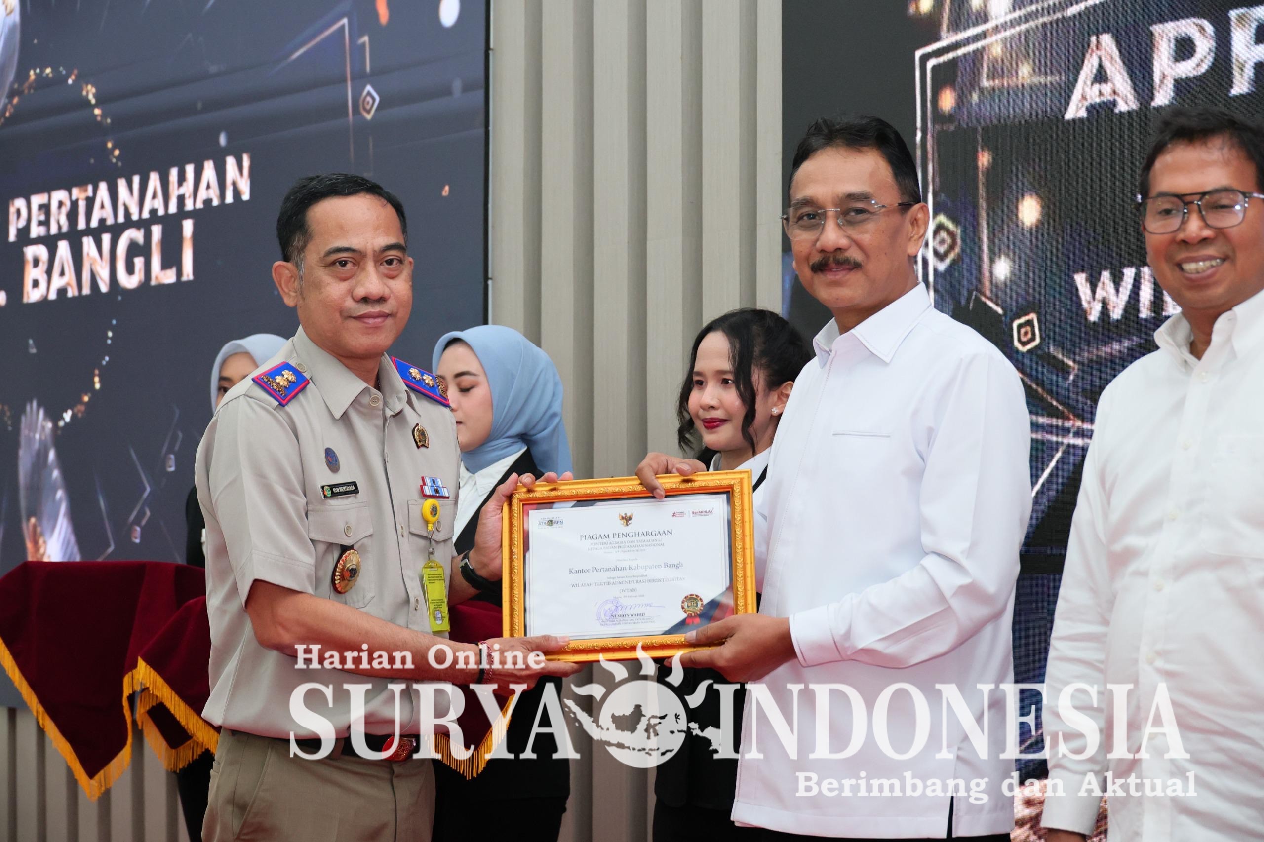 Dalam kegiatan tersebut, Kantor Pertanahan Kabupaten Bangli berhasil meraih predikat Wilayah Tertib Administrasi Berintegritas (WTAB). Penghargaan ini menjadi bukti nyata komitmen seluruh jajaran dalam mewujudkan tata kelola administrasi pertanahan yang tertib, transparan, dan akuntabel, sekaligus mendukung pelaksanaan reformasi birokrasi di lingkungan Kementerian ATR/BPN.