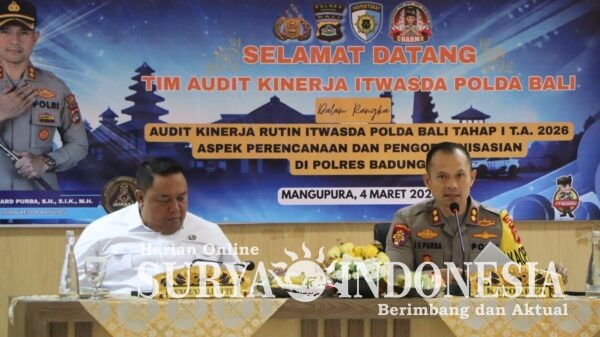 Mangupura, Surya Indonesia.net – Dalam rangka meningkatkan transparansi dan akuntabilitas dalam pelaksanaan tugas dan fungsi kepolisian, Polres Badung menerima kunjungan Tim Audit Kinerja dari Inspektorat Pengawasan Daerah (Itwasda) Polda Bali Tahap I Tahun Anggaran 2026 di Aula Polres Badung pada Rabu (4/3/26).