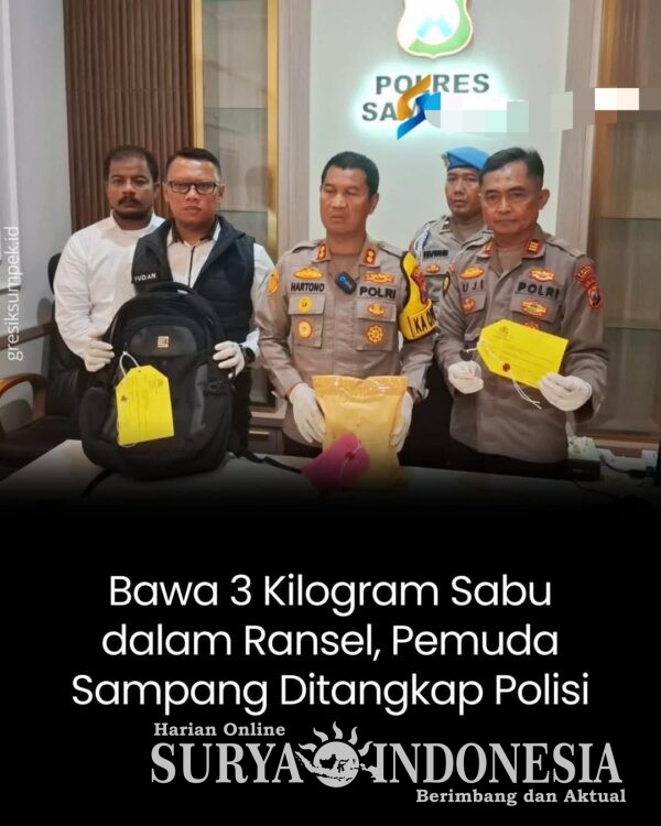 Sampang, Surya Indonesia.net – Seorang pemuda di Kabupaten Sampang, Jawa Timur, ditangkap polisi setelah kedapatan membawa sabu seberat lebih dari 3 kilogram yang disimpan di dalam tas ransel saat mengendarai sepeda motor.