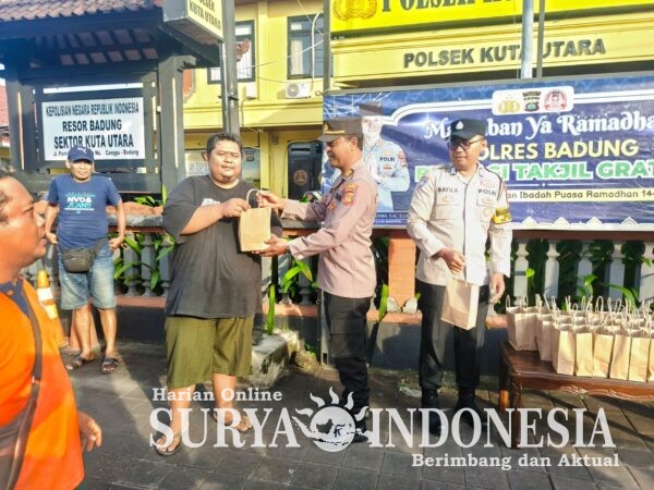 Kuta Utara, Surya Indonesia.net – Dalam rangka menyambut bulan suci Ramadhan, Polsek Kuta Utara mengadakan kegiatan berbagi takjil kepada pengendara motor yang melintas di depan kantor jalan raya Batu Bolong, Desa Canggu, Kecamatan Kuta Utara, Badung, Bali. Kegiatan ini bertujuan untuk memberikan sedikit kebahagiaan dan keberkahan kepada masyarakat yang sedang dalam perjalanan pulang ke rumah untuk berbuka puasa. Sabtu (7/3/2026) sekitar pukul 17.00 Wita