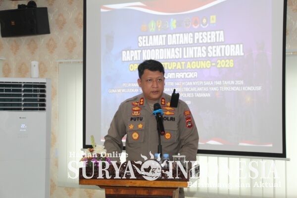 Tabanan, Surya Indonesia.net – Polres Tabanan menggelar Rapat Koordinasi (Rakor) Lintas Sektoral Operasi Ketupat Agung 2026 dalam rangka pengamanan perayaan Hari Raya Idul Fitri 1447 H dan Hari Raya Nyepi Saka 1948 Tahun 2026, bertempat di Aula Wisnu Hartono Polres Tabanan, Senin (9/2/2026). Kegiatan tersebut dipimpin langsung oleh Kapolres Tabanan AKBP I Putu Bayu Pati, S.I.K., M.H. dan dihadiri unsur Forkopimda, pimpinan instansi terkait, tokoh agama, tokoh masyarakat serta berbagai stakeholder di Kabupaten Tabanan.