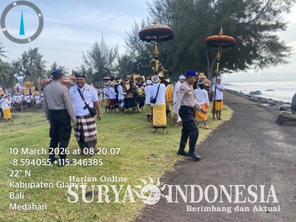 Gianyar , Surya Indonesia.net – Dalam rangka memberikan rasa aman dan menjaga situasi kamtibmas selama rangkaian Hari Raya Nyepi, personel Satuan Polisi Perairan dan Udara (Polairud) Polres Gianyar melaksanakan kegiatan patroli sekaligus pengamanan Upacara Melasti yang berlangsung di Pantai Masceti, Desa Medahan, Kecamatan Blahbatuh, Kabupaten Gianyar, pada Selasa (10/3/2026) mulai pukul 08.30 Wita.