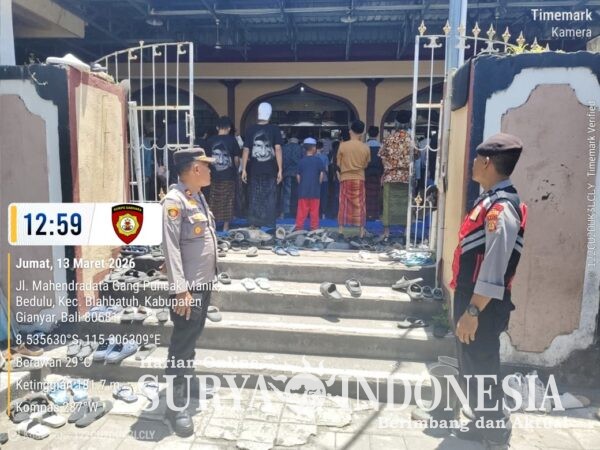 Blahbatuh, Surya Indonesia.net – Suasana khusyuk dan penuh kebersamaan mewarnai pelaksanaan ibadah Sholat Jumat di sejumlah masjid dan musala di wilayah Kecamatan Blahbatuh pada Jumat (13/3/2026). Dengan pengamanan dari jajaran kepolisian, kegiatan ibadah umat Muslim tersebut berlangsung aman, tertib, dan lancar.