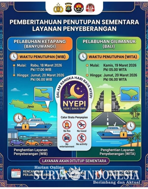 Bali, Surya Indonesia.net – Kabid Humas Polda Bali Kombes Pol Ariasandy S.I.K., menerangkan terkait menyambuh hari raya Nyepi tahun caka 1948, layanan penyeberangan lintas Ketapang – Gilimanuk akan dihentikan /ditutup untuk sementara, jumat 13/3/2026.