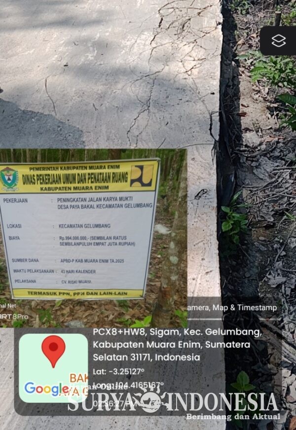 Muara Enim, – Pembangunan jalan setapak di Desa Payabakal, Kecamatan Gelumbang, Kabupaten Muara Enim, yang bersumber dari APBD Kabupaten Muara Enim Tahun Anggaran 2025, menuai sorotan keras dan serius dari kontrol sosial. Proyek bernilai Rp 994.000.000 dengan waktu pelaksanaan 40 hari kalender, yang dikerjakan oleh CV Riski Wijaya, diduga tidak memenuhi standar mutu konstruksi.