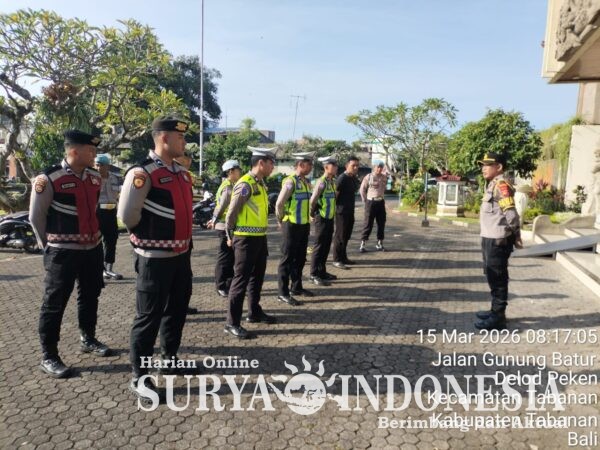 Tabanan, Surya Indonesia.net – Humas Tabanan. Sipropam Polres Tabanan melaksanakan kegiatan pengecekan dan pengawasan terhadap personel yang bertugas dalam pengamanan Festival Ogoh-Ogoh Singasana III Tahun 2026, Minggu (15/3) pagi. Kegiatan ini dilaksanakan di halaman Bank BPD Tabanan sebagai titik apel bagi personel yang terlibat dalam pengamanan kegiatan tersebut.