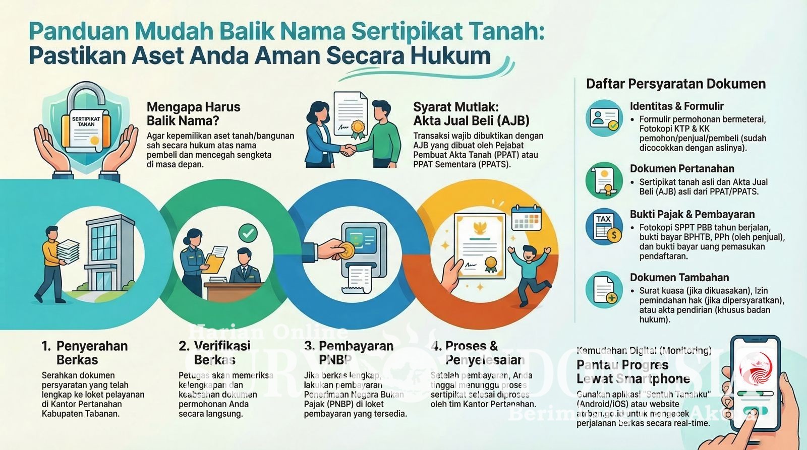 Kementerian Agraria dan Tata Ruang/Badan Pertanahan Nasional terus berkomitmen memberikan kemudahan digitalisasi. Kini, masyarakat yang sedang mengurus balik nama tidak perlu repot datang ke kantor hanya untuk menanyakan progres penyelesaian. Perjalanan berkas permohonan dapat dicek secara real-time melalui aplikasi Sentuh Tanahku (tersedia di ponsel Andoid dan iOS) atau melalui website resmi atrbpn.go.id.
