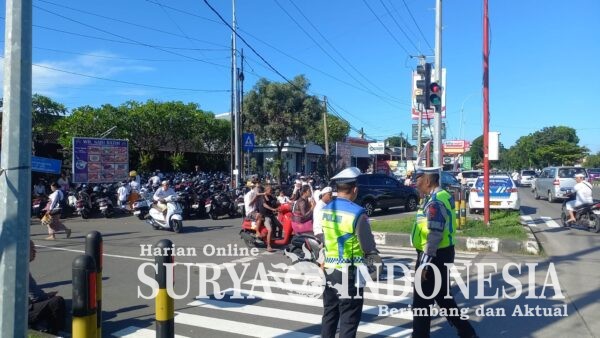 Personel di lapangan terlihat aktif melakukan pengaturan arus lalu lintas guna mengantisipasi kepadatan kendaraan, sekaligus memberikan pelayanan kepada masyarakat dengan membantu penyeberangan pejalan kaki yang hendak menuju lokasi Melasti.