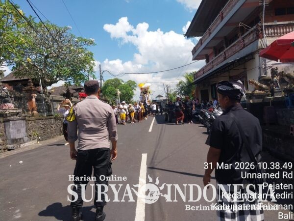 Selasa, 31 Maret 2026, mulai pukul 11.30 s/d 12.30 wita Bhabinkamtibmas Desa Pejaten, Polsek Kediri Brigpol I Putu Wahyudi, S.H. bersinergi dengan Pecalang atensi kegiatan ngaben Almarhum Ida Ayu Alit di setra Dalem Adat Pejaten.