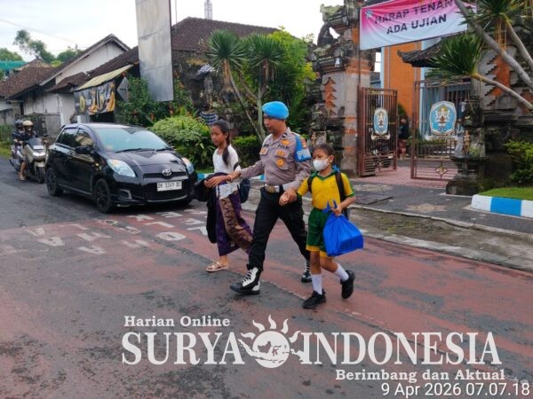 Gianyar, Surya Indonesia.net – Dalam rangka mewujudkan keamanan, keselamatan, ketertiban, dan kelancaran lalu lintas (kamtibselcarlantas), personel Polsek Gianyar melaksanakan kegiatan pengaturan arus lalu lintas (pos pagi) di depan SD Negeri 2 Gianyar, Jalan Ratna, Desa Tegal Tugu, Kecamatan Gianyar, pada Kamis (9/4/2026). Kegiatan ini merupakan bagian dari pelayanan rutin kepolisian di jam-jam rawan kepadatan, khususnya saat aktivitas masyarakat meningkat di pagi hari.