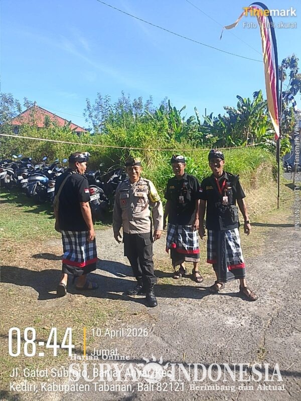 Polda Bali, Surya Indonesia.net – Polres Tabanan – Polsek Kediri.Pada hari ini, Jumat, tanggal 10 April 2026, pkl 08.30 wita, s/d selesai, Bhabinkamtibmas Desa Banjar Anyar 2, Polsek Kediri, Polres Tabanan, Aiptu I N Nendera bersama Pecalang adat sanggulan melaksanakan pengamanan rangkaian Upacara Pitra Yadnya (Ngaben masal). Dimana pada hari ini dilaksanakan giat Ngentenin/ngeplugin yang diikuti 23 Sawe/mayat ngaben dan 20 ngelungah di setra adat Sanggulan, Desa Banjar Anyar, Kecamatan Kediri, Kab. Tabanan. Untuk acara puncak/ ngaben akan dilaksanakan pada hari Minggu tanggal 12 April 2026 dan dilanjutkan, kegiatan meaja-ajar pada hari Senin tanggal 13 April 2026.
