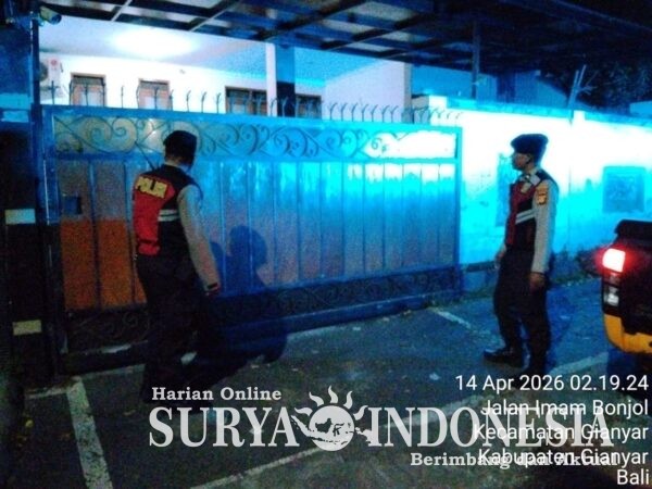 Gianyar, Surya Indonesia.net – Dalam rangka menjaga situasi kamtibmas tetap aman dan kondusif, jajaran Sat Samapta Polres Gianyar melaksanakan patroli dini hari menyasar kawasan permukiman warga yang ditinggal mudik, Selasa (14/4/2026) sekitar pukul 02.20 Wita.