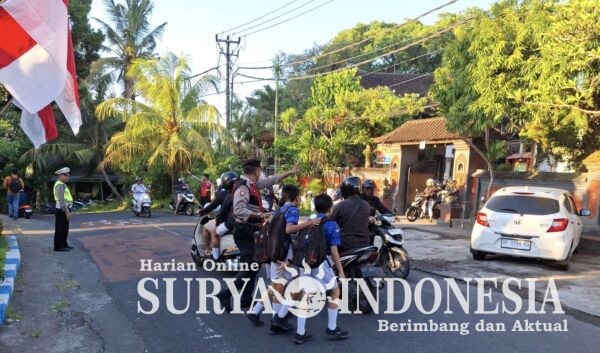 Gianyar, Surya Indonesia.net – Wujud kamtibselcarlantas, personel Polsek Gianyar melaksanakan kegiatan pengaturan arus lalu lintas melalui pos pagi di depan SD Negeri 2 Gianyar, Jalan Ratna, Desa Tegal Tugu, Kecamatan Gianyar, pada Selasa (14/4/2026). Kegiatan ini difokuskan pada jam sibuk pagi hari guna memberikan rasa aman dan nyaman bagi masyarakat, khususnya para pelajar yang hendak menuju sekolah.