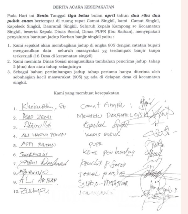 Berita Acara tersebut terlihat dalam daftar hadir adalah Camat Singkil, Kapolsek Singkil, Danramil Singkil, Kepala Dinas Sosial, Perwakilan Dinas PUPR (Ibu Raihan) dan Seluruh Kepala Kampong (Kepala Desa) se-Kecamatan Singkil. Senin (13/04/2026).