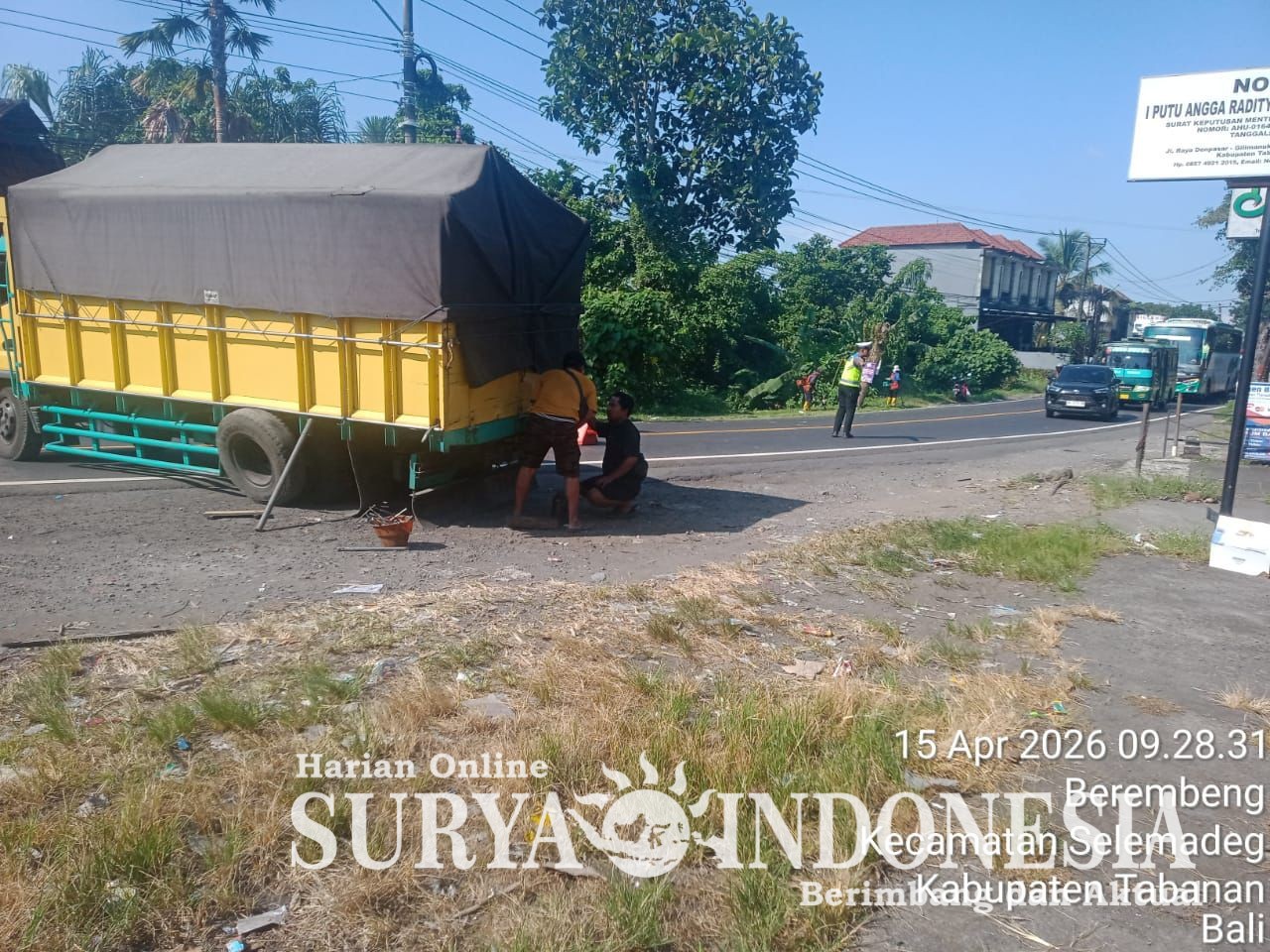 Polres Tabanan, Surya Indonesia.net – Polsek Selemadeg menunjukkan aksi sigap dalam pelayanan prima Kepolisian saat menangani truk Mitsubishi No.Pol. P 9923 VH yang mengalami patah baut roda belakang di jalur utama Banjar Dinas Berembeng, Rabu (15/04/2026). Truk bermuatan 3 ton beras yang dikemudikan Slamet Edy Pranowo tersebut mendadak mogok dan melintang di badan jalan saat melaju dari arah Gilimanuk menuju Denpasar pada pukul 09.00 Wita. Menanggapi situasi yang berpotensi memicu kemacetan panjang, personel Polsek Selemadeg dipimpin Pawas Iptu I Made Adiguna, S.Pd langsung diterjunkan ke lokasi untuk melakukan pengaturan arus lalu lintas dengan sistem buka-tutup secara presisi.