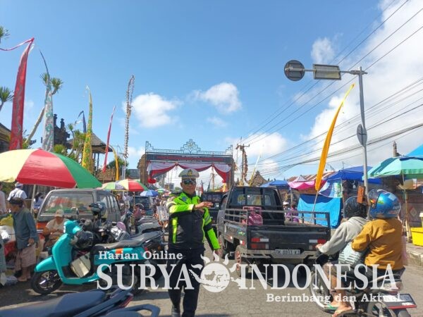 Dengan pendekatan yang humanis dan sigap, personel kepolisian aktif memberikan pelayanan kepada masyarakat, terutama dalam mengantisipasi kepadatan kendaraan dan menjaga keselamatan pejalan kaki di sekitar kawasan pura yang cukup ramai.