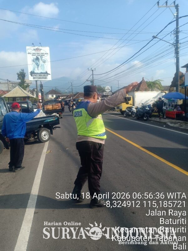 Polres Tabanan, Surya Indonesia.net – Polsek Baturiti melaksanakan kegiatan strong point pagi pada Sabtu, 18 April 2026 pukul 07.00 Wita bertempat di kawasan Pasar Baturiti. Kegiatan ini dilaksanakan untuk mengantisipasi kepadatan arus lalu lintas pada jam aktivitas masyarakat di pagi hari.