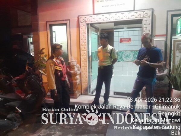 Mengwi , Surya Indonesia.net – Dalam rangka menjaga situasi kamtibmas tetap aman dan kondusif, Polsek Mengwi melaksanakan kegiatan patroli Kegiatan Rutin Yang Ditingkatkan (KRYD) dengan menyambangi objek vital perbankan, salah satunya Bank BPD Bali Capem Beringkit, wilayah Kecamatan Mengwi, Kabupaten Badung. Sabtu malam (18/4/2026)