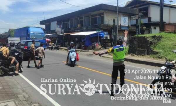 Polres Tabanan, Surya Indonesia.net – Dua personel Polsek Selemadeg, Aiptu I Wayan Mudastra dan Aipda I Komang Anom Ariasa Argapa, melaksanakan pengamanan Strong Point di Simpang Pasar Bajera, Senin (20/4/2026) siang. Petugas secara sigap melakukan pengaturan arus serta membantu penyeberangan anak sekolah guna mencegah kemacetan dan kecelakaan di titik padat tersebut.