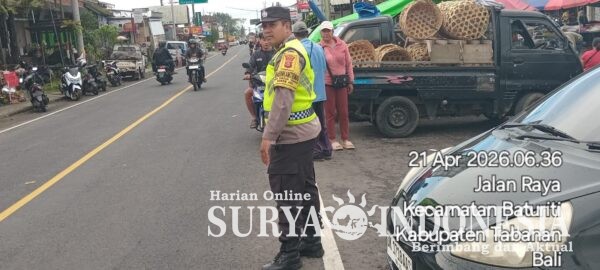 Personel Polsek Baturiti melaksanakan pengaturan dan pemantauan arus lalu lintas di depan Pasar Baturiti dengan kekuatan dua personel. Kehadiran personel di lapangan bertujuan untuk memberikan rasa aman dan nyaman kepada masyarakat pengguna jalan.