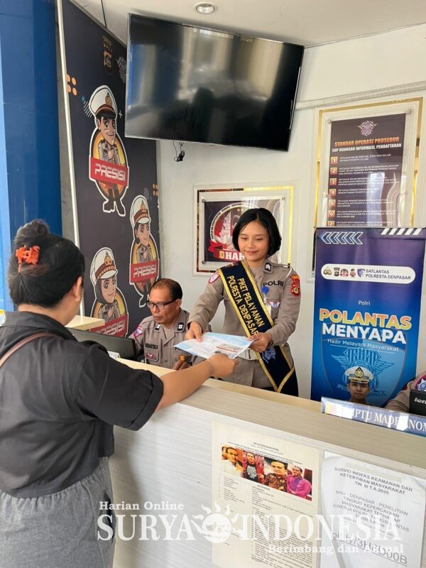 Denpasar, Surya Indonesia.net – Wajah pelayanan publik yang ramah dan profesional kembali ditunjukkan oleh Satuan Lalu Lintas Polresta Denpasar melalui program “Polantas Menyapa”. Dalam suasana pelayanan yang tertib dan nyaman, petugas kepolisian tampak sigap membantu masyarakat yang mengurus administrasi lalu lintas, mulai dari penerbitan hingga konsultasi dokumen.