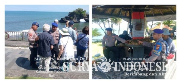 Polda Bali, Surya Indonesia.net – Polres Tabanan – Humas Tabanan. Personel Sat Polairud Polres Tabanan melaksanakan patroli pesisir di kawasan obyek wisata Tanah Lot pada Jumat (24/04/2026) pukul 13.00 WITA. Kegiatan dipimpin oleh KBO bersama anggota, dengan menyasar aktivitas wisatawan lokal maupun mancanegara yang berkunjung di area pantai. Patroli ini bertujuan memberikan rasa aman dan nyaman sekaligus mencegah potensi gangguan kamtibmas di kawasan wisata unggulan tersebut.
